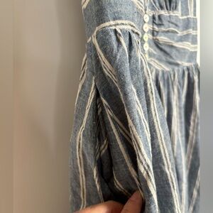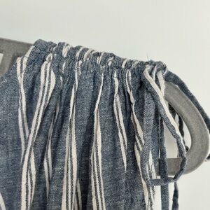 Free People / Anthropologie Roll the Dice Linen Stripe Dress. Excellent used condition. Gorgeous blue and white striped linen & cotton blend dress. Partially lined (skirt). Adjustable shoulders / sleeves. Versatile style. Gathered elastic waist with shell buttons. Runs just a bit large - would fit a size 6 to 8 best. Elastic shirring in back. See flat measurements below & photos/ video.