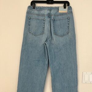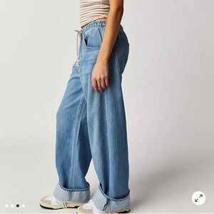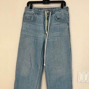 Comfortable boyfriend jeans with a drawstring waist. Perfect for a laid-back look. Sky blue denim adds a fresh touch.