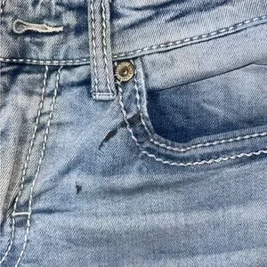 Classic slim straight fit. Light blue denim. Stylish back pocket design.