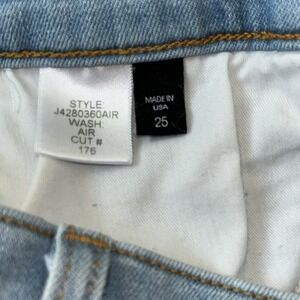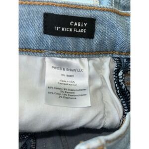 The Veronica Beard Jeans 25 Carly Kick Flare in Blue are high-rise jeans with a tuxedo stripe detail, featuring a flattering flared leg style. Made from a comfortable cotton blend fabric with a light wash, these jeans have a zip and button closure, pockets, and stretch for added comfort. Perfect for a stylish yet effortless look, these jeans are a versatile addition to any woman's wardrobe.versatile