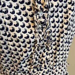 Previously owned. Stylish blouse with a unique chicken pattern. Features short sleeves and button accents. Ideal for versatile wear.
