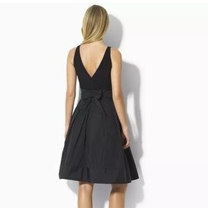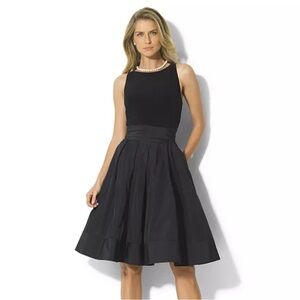 Elegantly pairing sleek matte jersey at the bodice with a lustrous pleated taffeta skirt, Lauren Ralph Lauren's cocktail dress is finished with a chic scoop neckline and self-tie taffeta sash at the waist for stunning style.