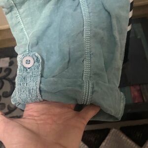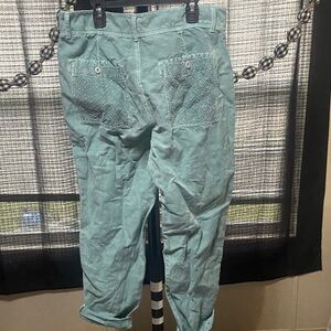 Chic teal cropped pants with button accents. Ideal for casual outings.