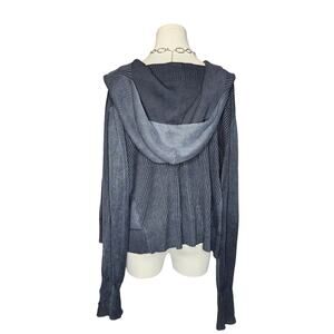 This hoodie top has a draped cowl neck, soft knit construction, and a ribbed look all throughout. Also has thumbholes. The color of this hoodie is a washed out / faded dark gray charcoal color. Perfect for layering and elevating any look. Can be unisex, and similar to the Pima sweater by Nicholas K