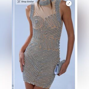 AKIRA Silver and Cream Rhinestone Mesh Mini Dress. NWT