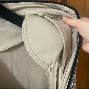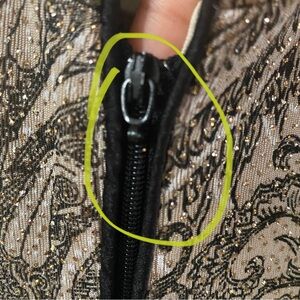 Chic Zip jacket with a detailed paisley pattern. Features black and gold tones. This jacket is in good pre-owned condition, but the zipper pull is missing; see photo. It is still working well aside from the missing pull. Please review all photos, manufacturing materials, and measurements carefully before making a purchase.