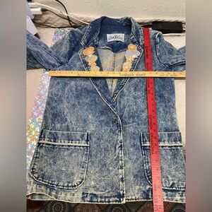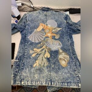 Super unique coastal cowgirl vibe acid wash denim single button blazer with shell and pearl embroidery on the front and back.