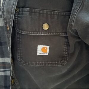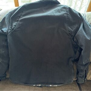 Mens carhartt large tall black snap button shacket pockets has some paint on bottom see pic only place it is located heavy flannel lined canvas pit to pit is 25” overall length from shoulder to bottom is 32” sleeve length is 27”