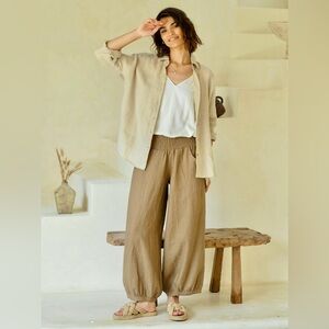 Made from eco-friendly OEKO-TEX® STANDARD 100 certified French linen, this luxurious, medium-weight plain weave fabric is double pre-washed for exceptional softness, free from harmful chemicals, gentle on the skin, and incredibly breathable. Our signature Sadhu Pants feature a relaxed fit, tapered hem, and a figure-flattering elastic waistband for the perfect blend of comfort and style. Effortlessly chic and versatile, they pair seamlessly with any top from our Nomad kindred collection.