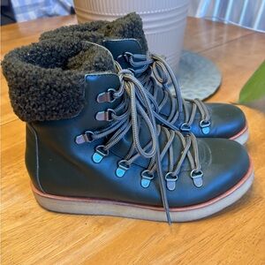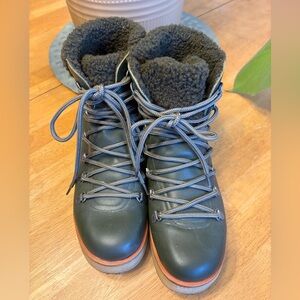 Anthropologie Stylish Green Leather Lace-Up Boots with Fur Lining Size 7