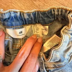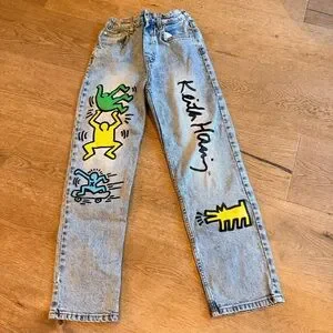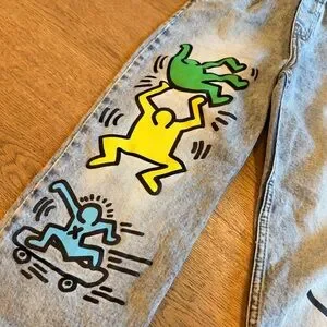 Stylish jeans featuring Keith Haring's iconic artwork. Vibrant graphics in green, yellow, and blue on a light denim base. Elastic waist for adjustment