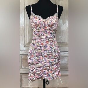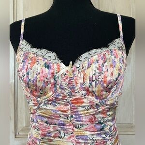 A delicate and romantic dress, often described as ethereal and feminine. It features a soft silky satin fabric with delicate scalloped lace, and is known for its adjustable shoulder straps, functional drawstrings along the side seam, includes underwire cups with pintucked detailing and an invisible zipper closure at the center back.