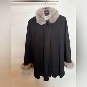 Chic black poncho with soft faux fur trim. Ideal for layering and adding elegance. Worn just a few times. One button is loose but easy to sew back on. One fur sleeve has some stain as shown in photo, I think it can get cleaned, didn’t try.