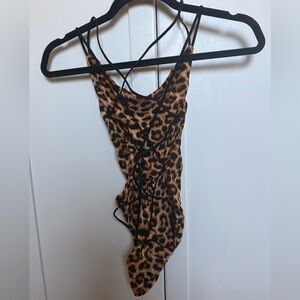 Sexy leopard print bodysuit with open back and strappy details. Perfect for a bold look.