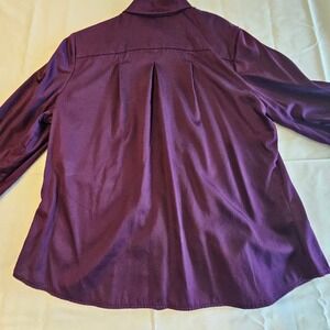 Coldwater Creek Plum Purple Pleated Tuxedo Front Button Down Blouse, Petite Large. This sophisticated top features a detailed tuxedo-style pleated front and unique pleated button cuffs. The rich plum shade makes it a perfect choice for professional or occasional wear. Made from a comfortable cotton blend with a touch of stretch for a flattering fit. Features a classic collar and full button-up closure. Excellent pre-owned condition with no visible flaws, holes, or stains. Skims the body beautifully with back pleat detailing for added movement. Material: 97% Cotton, 3% Lastol. Measures approximately 20 inches pit to pit and 25 inches in length.
