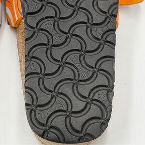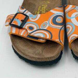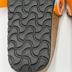 These are a preowned GUC pair of Papillio Birkenstock Catalina Sandals Womens 4.5/5- EU 35 Orange Blue Circles geometric pattern. Single strap with adjustable buckle. These are in great condition light toe print not dark soil stains. These are small size 4.5/5 in women’s or can be children’s sized. Minimal wear on the soles.