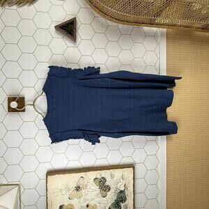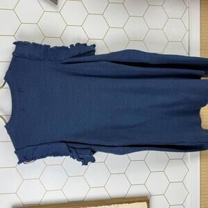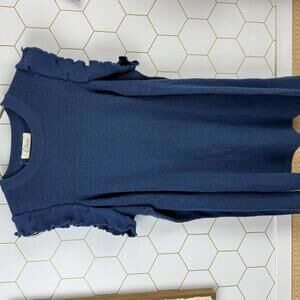 Cozy and stylish navy blue knit sweater featuring charming ruffle details on the shoulders. Perfect for adding a feminine touch to your casual or office wardrobe. The fitted silhouette and long sleeves make it a versatile piece for cooler days.