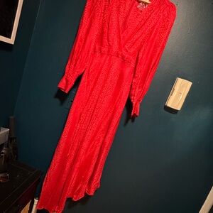 Chic red dress with subtle leopard pattern. Ideal for evening wear. Missing buttons in sleeves.