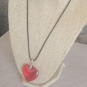 Very cool red heart necklace on a black cord. I can be adjusted from 18 to 20 inches. Great to wear with any casual wear. Great value too.