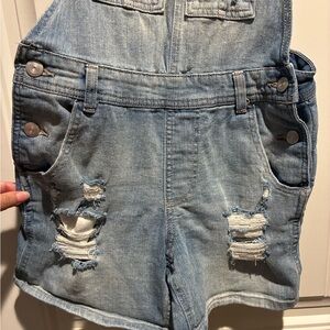 Trendy denim overalls. Light blue color. Distressed details. Adjustable straps. Front pockets.