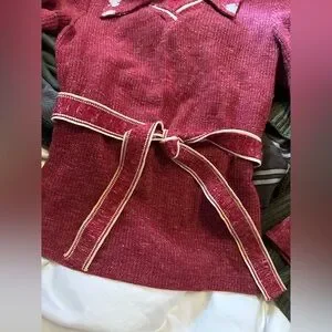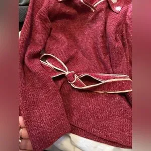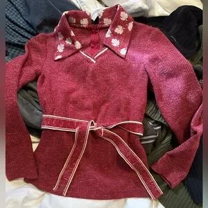 Stylish red knit sweater featuring a floral collar and matching belt. Perfect for a chic look. Good vintage condition looks like the Canadian leaf collar.