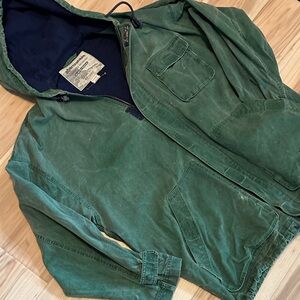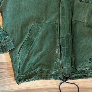 Classic hooded jacket in forest green. Features a soft lining and durable fabric. Abercrombie & Fitch Forest Green Canvas Saltwater Distressed Hooded Jacket, size medium. Several pockets. Distressed look. Heavy duty zippers with Velcro closure over the zipper. Light wear and markings.