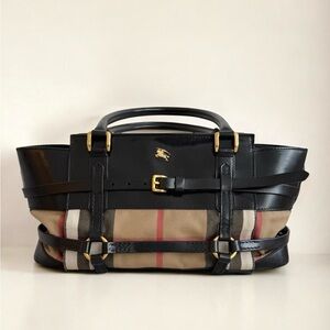 Gorgeous Burberry east west bridle house check shoulder tote bag with the most luxurious box calf leather sheen. She has a cute casual slouch from the plaid canvas body that is buckled and belted in gold hardware.