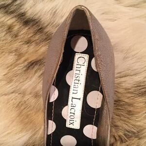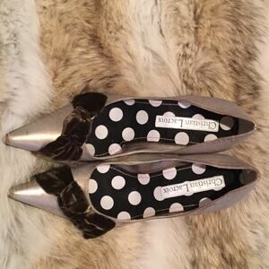 Christian Lacroix Golden brown 4" stiletto high heels with gold hue and brown velvet toe bows worn for about an hour. These are one of a kind and truly breathtaking . Dressy casual black tie cocktail evening jeans farmhouse contemporary vintage retro y2k 80’s 90’s pop art celeb style statement like new euc leather soles polka dot lining whimsical one of a kind