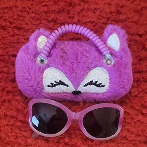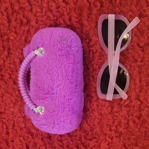 Adorable purple fox plush handbag with matching sunglasses. Perfect for adding a playful touch to any outfit.
