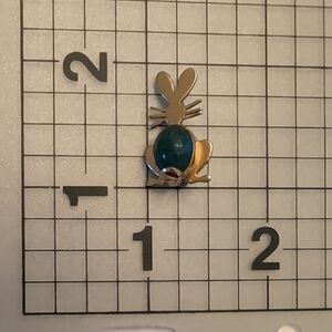 Elegant gold bunny brooch with a green stone centerpiece. Adds charm to any ensemble. Marked WRE 1/20 12KGF
