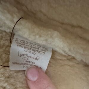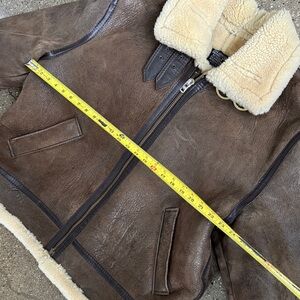 Classic brown leather jacket with cream shearling collar and lining. Features buckle detail and front pockets.