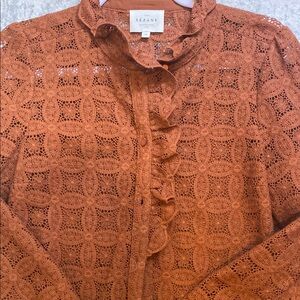 Elegant brown lace blouse. Features ruffled collar. Long sleeves with intricate pattern. Never got to wear as I lost weight, but the color is marvelous for any Autumn or warm toned ladies.