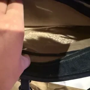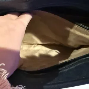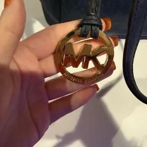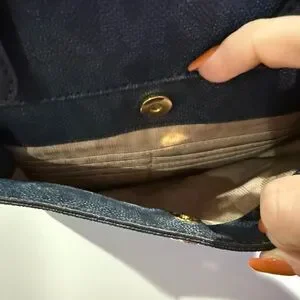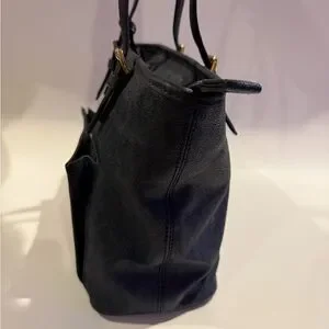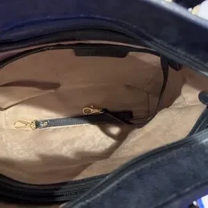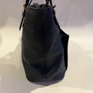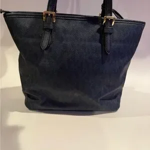 Chic dark blue tote with front pocket. Ideal for daily use. Features sturdy handles.
