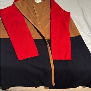 Chic colorblock design. Red sleeves, tan top, navy bottom. Open front with belt. Ideal for layering.