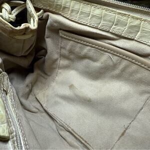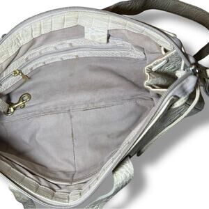 Gorgeous vintage Brahmin croc-embossed genuine leather shoulder bag in a soft buttercream/ivory color. Classic early-2000s Brahmin design with their signature ship medallion, suede interior, and structured barrel silhouette. This style is hard to find now and perfect for collectors or anyone who loves vintage leather bags.