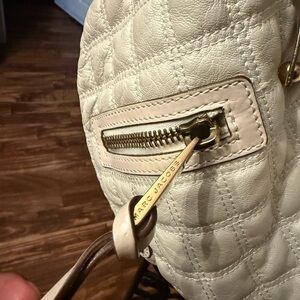 Marc Jacob’s quilted leather bag in a cream color, gold hardware. This is a medium size bag in used but excellent condition, bag was originally just over $900.00… well suited for casual and semi formal occasions.
