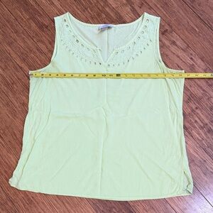 Chic lime green tank with eyelet details. Sleeveless and stylish. Perfect for warm days. Gently worn condition. Laying flat, approximately 20.5” pit to pit and 25” long. Send me an offer or bundle for a discount! Non-smoking home.