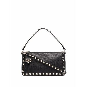 black calf leather grained texture gold-tone Rockstud embellishment single top handle detachable shoulder strap logo print to the front main compartment internal card slot internal logo patch full lining top zip fastening hook fastening Rockstud small leather shoulder bag