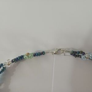 This elegant necklace features a stunning array of multicolor beads, perfect for adding a touch of sophistication to any outfit. The intricate design showcases beautiful shades of blue, green, and silver, making it a versatile accessory for any occasion.