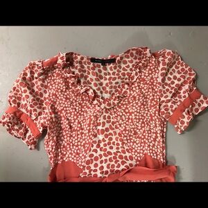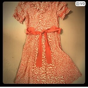 Marc Jacobs high low dress. Size 2. Orange and white colors. Silk tie around waist. 100% silk. Lying flat front is approximately 30 in long and back is 36.5 inches. Short sleeves. Excellent condition.