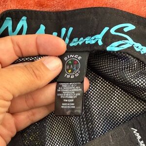These are Maui and Sons board shorts featuring a vibrant, all-over surf-themed graphic print. They are made by the well-known surf lifestyle brand Maui and Sons and incorporate bold colors and logos in a retro style.
