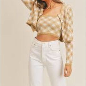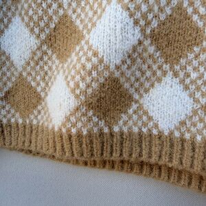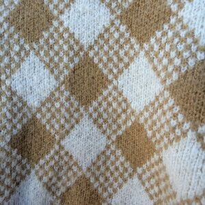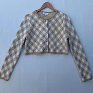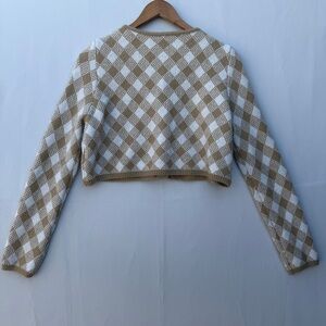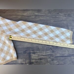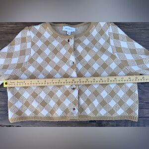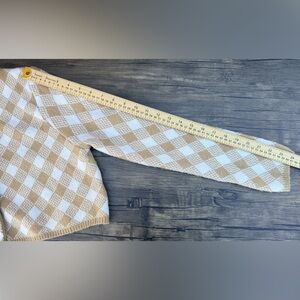 Stay cozy and stylish with this tan and white checkered cardigan. Perfect for layering, this piece adds a touch of elegance to any outfit.