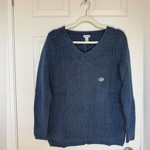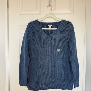 Cozy blue knit sweater with a classic V-neck. Ideal for layering.