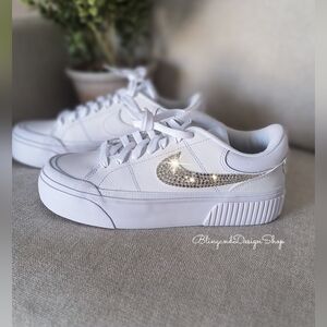 Women's Nike Court Legacy Lift White Sneakers Customized With Clear Crystals