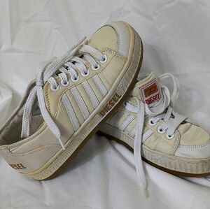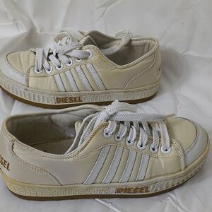 They feature off white canvas uppers, a rubber toe cap, three white side stripes reminiscent of classic athletic shoes, and a contrasting rubber sole with the "DIESEL" logo in gold lettering on the side.