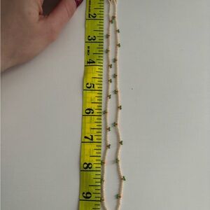 This elegant beaded necklace features a delicate combination of cream and green beads, perfect for adding a touch of sophistication to any outfit.