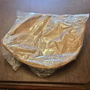 Retired Pampered Chef Beautiful round woven serving tray. Features sturdy handles for easy carrying. Perfect for serving or decor. Tray is 17" was designed to be used with the Pampered Chef round baking stone but can be used for serving anything.