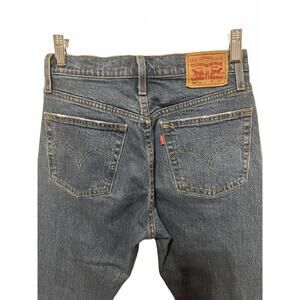 Classic Levi's high rise jeans with a straight leg fit. Made from durable denim for everyday wear. Features traditional five-pocket styling and button fly closure. Versatile medium blue wash pairs well with various tops and shoes.