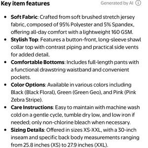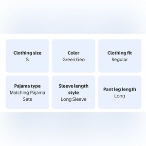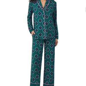 Stylish green pajama set with geo pattern. Features a button-up top and matching pants. Pre-owned, worn once.
