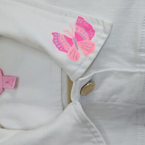 White denim with pink flowers on the back and a butterfly on the front collar